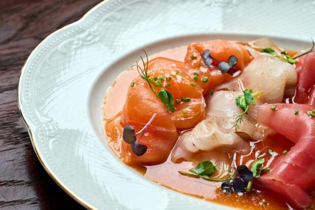 Здесь — карпаччо из четырёх видов рыбы, одно из первых блюд, позволивших москвичам открыть для себя культуру сырой рыбы. Фаршированный карп по-еврейски — отсылка к домашним традициям и кухням, с которыми ассоциировалась Москва 90-х. Уха из трёх видов рыбы с мини-расстегаями стала классикой русской линии меню — прозрачный бульон и тёплая выпечка, без которых трудно представить этот ресторан.