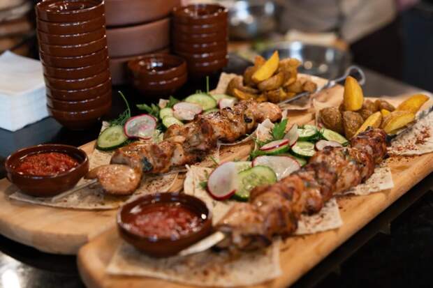 Шашлыки и кебабы. Мангал здесь — отдельная история: мясо маринуется так, что сохраняет сочность и аромат, а подача с грузинскими соусами делает вкус ярким и живым. Корейка, люля-кебаб, куриные шашлыки — каждое блюдо раскрывается по-своему, но неизменно с акцентом на текстуру и насыщенность.