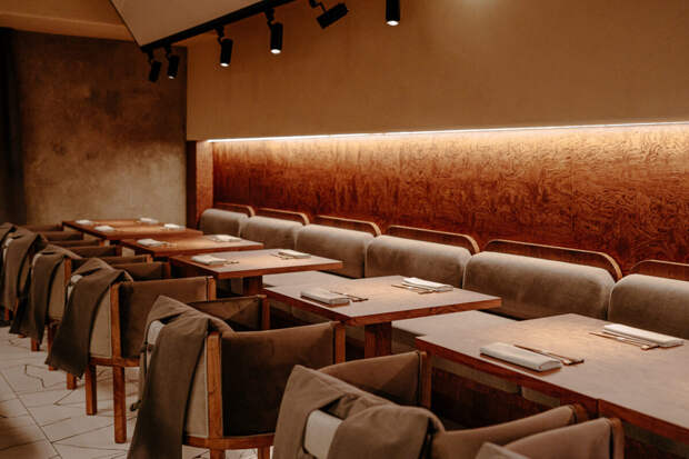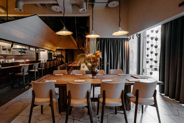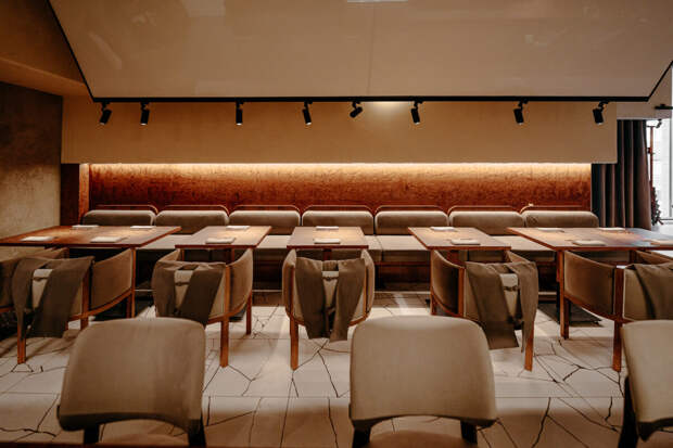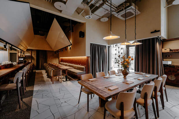 Дизайн, созданный студией ANZA by Anastasia Zemlyanskaya, построен на минимализме и тактильности материалов. Пространство объединяет несколько зон посадки, контактный бар и открытую кухню, а одним из ключевых элементов интерьера становятся экраны проектора под потолком — отсылка к эстетике старого японского кино и фильмам Ясудзиро Одзу.