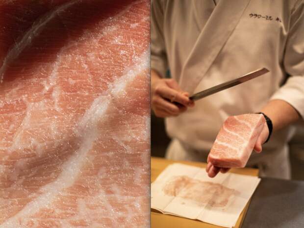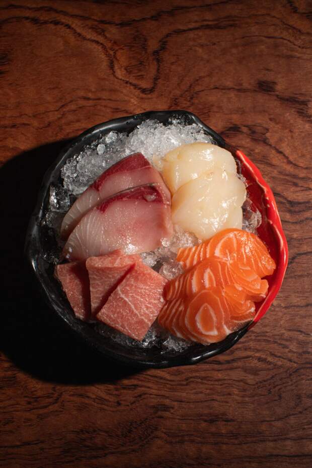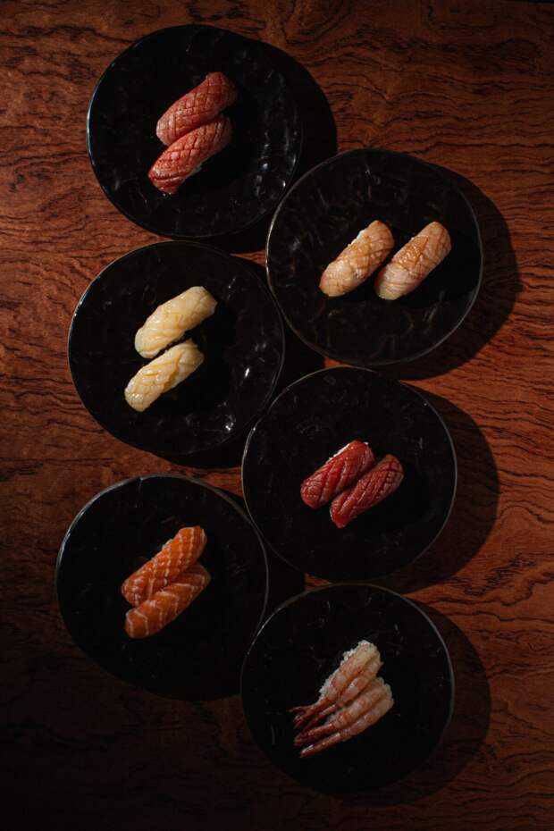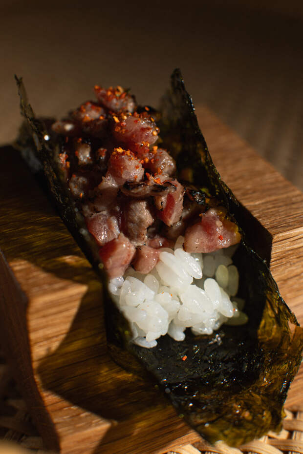 Меню открывает раздел с сашими: хамачи (1700 р.), лосось (900 р.) и жирное брюшко тунца — чу-торо (2300 р.). Далее суши с вагю и соусом терияки (1900 р.), с гребешком (600 р.) и тунцом (1400 р.), хенд-роллы с вагю абури (1100 р.) или нежным крабом (550 р.), а также роллы с угрем, фуа-гра и трюфельным айоли (700 р.) и с крабом, лососем и гребешком (1700 р.).