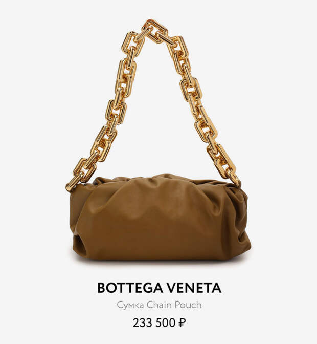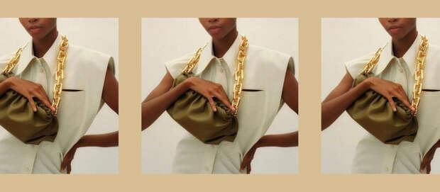 В коллекцию Bottega Veneta весна-лето 2020 вошла обновленная модель культовой сумки Pouch. В этом сезоне креативный директор бренда Дэниел Ли предлагает носить сумку на цепи с крупными звеньями.