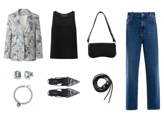 Образ, вдохновлённый эстетикой «old money» (старых денег), но с бунтарской искрой: атласный жакет с бамбуковым восточным принтом сочетаем с тёмно-синим денимом.