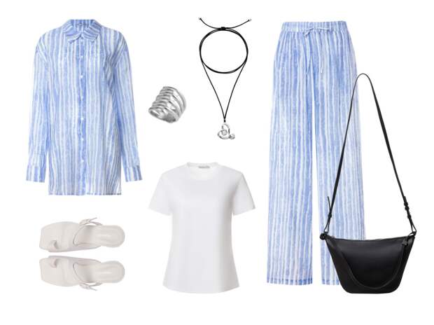 Костюм из струящегося хлопка с горизонтальными полосками, напоминающими морскую рябь. Свободная блуза-рубашка — универсальный солдат гардероба: наброшенная поверх купальника на пляже или в тандеме с базовой футболкой для прогулки по городу.