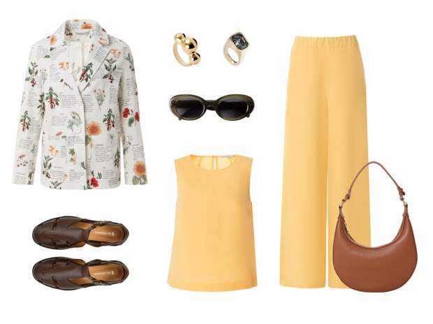 Жакет из фактурного хлопка, усыпанный винтажными цветами, в паре с костюмом из хлопка и льна жизнерадостного солнечно-жёлтого цвета.