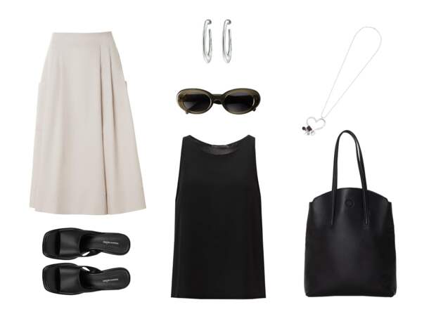 Дуэт из чёрного топа из струящейся вискозы и хлопковой юбки-шортов. Шелковистая гладкость вискозы, свободно облегающей тело, контрастирует с текстурой натурального хлопка юбки, добавляя глубину и интерес. Мюли на миниатюрном каблуке добавят лёгкости походке, а серебристые акценты в аксессуарах — дерзкий блеск.