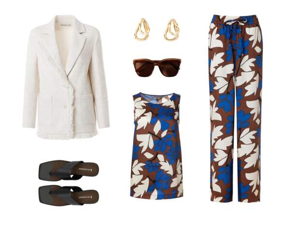 Молочный жакет с бахромой контрастирует с пижамным костюмом из вискозы с ярким принтом. Мягкий, струящийся костюм дарит ощущение безмятежности, в то время как жакет придаёт законченность и лоск.