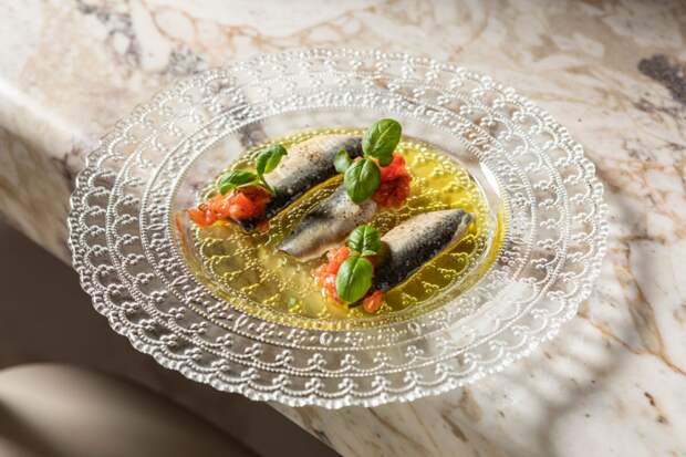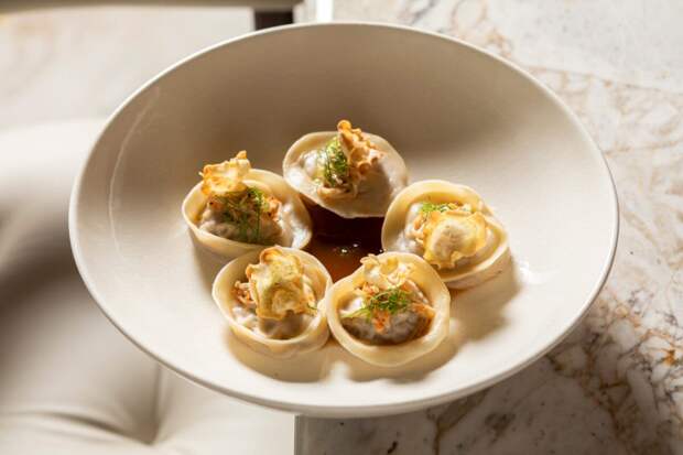 Так, хариус из Сибирских озер подается на манер знакомой киевской котлеты – рыба начиняется укропным маслом, картофельным кремом, обжаривается в панировке и оказывается на тарелке в компании с соусом на основе голландского сыра пятилетней выдержки и грано подано. Балтийская сардина, известная как иваси, маринуется в оливковом масле с овощами, травами и цитрусами – как принято на юге Италии. А нельма или деликатесная белорыбица подается в тонких слайсах, подчеркивающих ее естественный вкус. Кроме водных даров в меню – мраморная говядина, дичь и разное мясо: например, алтайский марал, вагю, филе миньон и весовой томагавк.