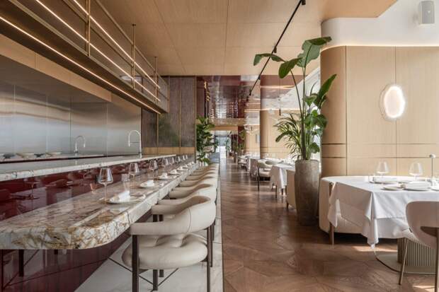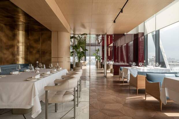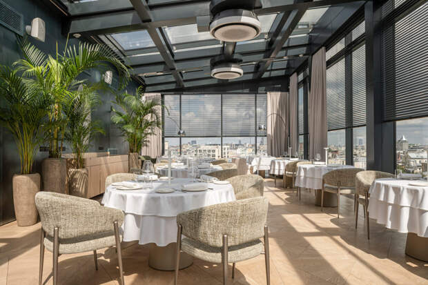 Само пространство распределено по периметру вокруг 12-го этажа Cosmos Selection Moscow Arbat: много живой зелени, света, природных текстур, а вместо стен – окна от пола до потолка. Каждый стол – видовой, с захватывающей панорамой на Храм Христа Спасителя, Кремль, Арбат и весь исторический центр Москвы. Для особых событий сложен отдельный зал с прозрачной крышей – это куб из стекла, будто парящий над Москвой.