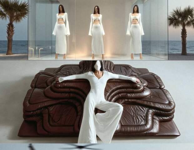 На входе гостей встречает 8-метровый LED-экран, транслирующий фирменные эпатажные видеокампейны, в интерьере тканевый арт-объект с архивным кадром из первого лукбука бренда, винтаж из Франции 70-х годов и мебель из собственной коллекции G-HOME. Минимализм, выразительные детали и узнаваемый характер –– всё это создаёт атмосферу, в которой ощущается идея марки.
