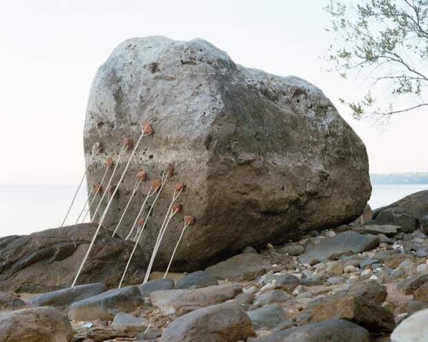 Проект «Скульптуры» отличает не только длительность наблюдения, но и перформативность жеста: Тощев создаёт форму, вступая в диалог с геологией, сезонными циклами, ландшафтом и течением.