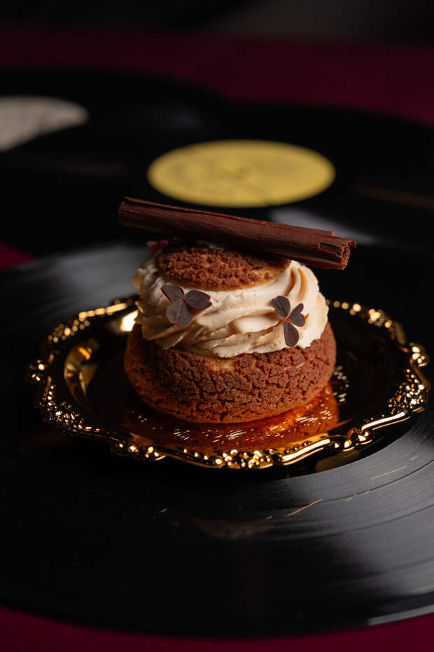 - Шу с бананами и мисо-карамелью (450 руб.) десерт с характером: сладкий, сливочный и чуть солоноватый, как любимая песня с неожиданной нотой.