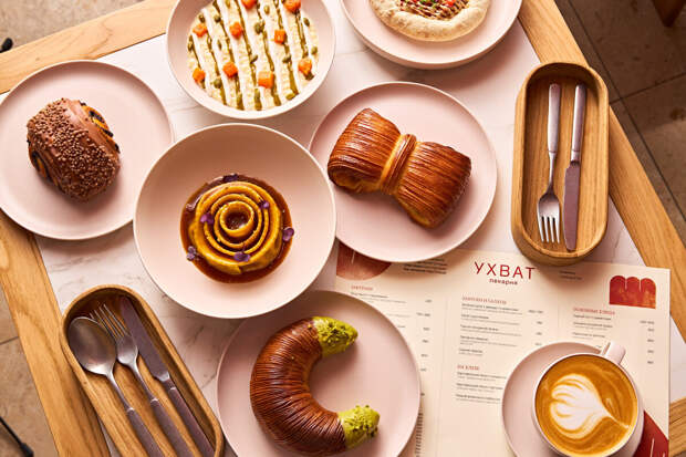 Кондитерская витрина также представляет традиционную русскую выпечку в авторском стиле: ту самую московскую плюшку, слоёную ватрушку с творогом, медовый пряник с маком, ностальгический рогалик из Советского Союза с фисташковым кремом, шоколадный колобок, словно оживший из русской народной сказки, и даже бородинский круассан с кориандром. Благодаря изобретательности шефов пекарни «Ухват» появился также «забытый» круассан угольного цвета с ванильным кремом: по задумке его как будто не успели вовремя достать из печи.Особого внимания в основном меню заслуживают тартар с сырными шариками из грана падано, сырный крем-суп, равиолоне по-флотски – оригинальное, гастрономичное прочтение тех самых макарон.