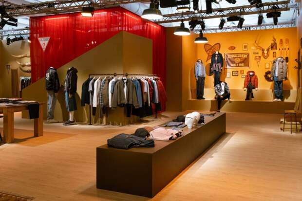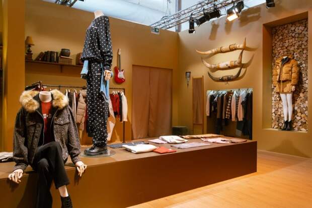 Экспозиция бренда, созданная под руководством Николая Марсиано, директора по развитию нового бизнеса, напоминает горную хижину на Западном побережье. Имитация хвойного леса, фактурные поверхности, деревянная мебель и теплый свет отражают связь моды и природы.