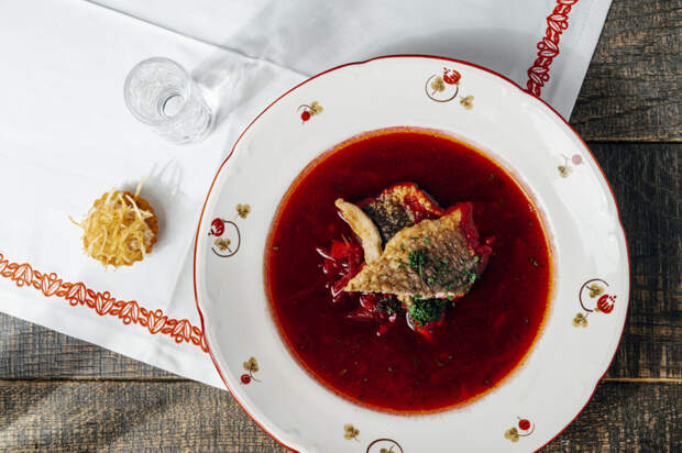 Борщ с карасями — старинный рецепт известный со времён Пушкина. К нему подадут тарталетку с рийетом.