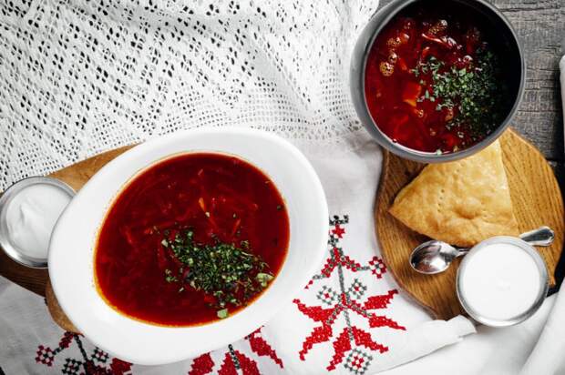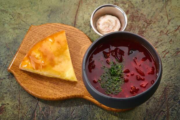 Кубанский борщ в каждой станице готовят по-своему, а в «Матрёшке» варят с красной фасолью и говядиной. К нему идет адыгейский пирог с сыром и картофелем.