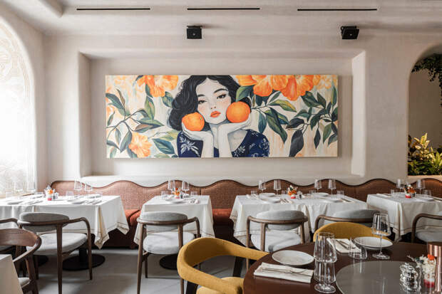 Традиционный грузинский орнамент, основанный на мотиве цветущей виноградной лозы, лег в основу росписей арок высоких окон, а яркая картина с изображением чернобровой красавицы с сочными апельсинами в руках стала визитной карточкой бистро. Удобные диваны и комфортные кресла, красивые столешницы темного дерева и столы с белыми скатертями – для каждого настроения здесь найдется свой уютный уголок.