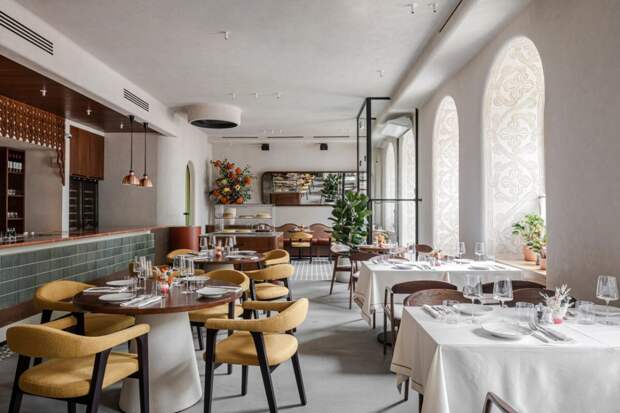 Светлый праздничный интерьер бистро создан дизайнерским дуэтом Ирины Кривцовой и Татьяны Рединой. Грузия их глазами проступает в мягкой фактуре стен, словно вылепленных руками, акцентном светильнике из керамических амфор-квеври и напоминающем ажурную резьбу тбилисских балконов фризе над барной стойкой.