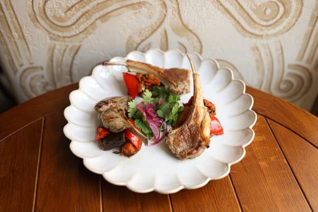Основные блюда начнем с супов. Детям – куриная лапша, мужчинам – убедительный харчо. Далее следуют чкмерули с кусочками хрустящей золотистой жареной курицы в нежном сливочно-чесночном соусе, оджахури, жареная картошка с говядиной, порцию которой в соответствии с названием («оджахури» по-грузински значит «семейное») можно разделить на всю семью, томленая с овощами баранина чанахи, чашушули с говядиной и прочие цыплята тапака. Настоящие шедевры – каре ягненка, пахнущее луговыми травами, и наполеон из стриплойна, в котором тонко нарезанный стейк чередуется с почти невесомыми слоями жира.