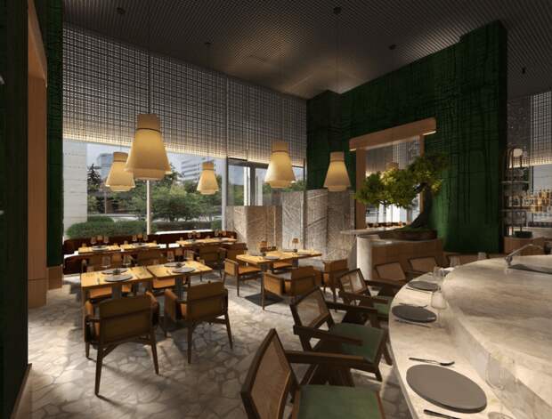 Погружение в азиатскую эстетику продолжается и в интерьере: зеленые оттенки, фактурные покрытия, лианы на потолке, канаты в тайско-балийском стиле. Мебель из натуральных материалов — дерева, кожи, камня — подчеркнет связь с природой. В центре зала — открытая кухня и бар, перетекающий в будущий chef’s table. Также предусмотрен отдельный кабинет на 6 мест на втором этаже.