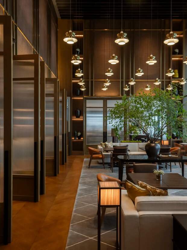 Главное лобби расположено на 75-м этаже. Оно спроектировано как «крыльцо на высоте» — место, где гость впервые видит город сквозь панорамные окна, а не через входную дверь. С этого уровня начинается знакомство с философией Park Hyatt: сдержанная элегантность, внимание к ремеслу и пространство, наполненное воздухом.