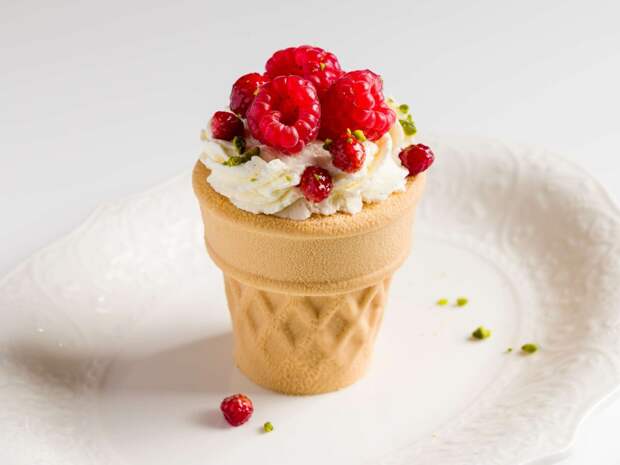 Первая нота новой коллекции Римские каникулы (560 руб.) — лёгкий ванильный мусс с малиновым кремё и свежими ягодами подан в виде вафельного стаканчика мороженого, напоминающего солнечные улицы Рима и атмосферу свободы.