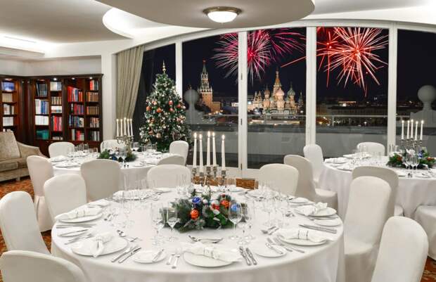 Главное событие — гала-ужин в зале «Библиотека» с панорамой Кремля и бой курантов на Спасской башне. На шведском столе — морепродукты, осетрина, роллы, десерты и безлимитное шампанское.