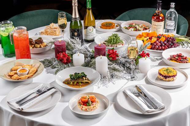 Гостей будут угощать холодцом с крабом и креветкой, оливье с лососем, селедкой под шубой, мини-чебуреками и салатом «Каталана» и с телячьим языком, а на горячее предложат выбор (можно выбрать два блюда из трех) – телячьи щечки, дорадо со шпинатом и шалфейным соусом или утиную грудку с бататом. А под финал праздника шеф подаст свой фирменный Наполеон – чтобы будущий год был во всех смыслах сладким. Не будет недостатка и в напитках: просекко, шампанское, разнообразные вина, крепкий марочный алкоголь, домашний лимонад, кофе и чай. Гости могут выбрать новогодний сет на две персоны за 25000, 50000 и 70000 рублей – в зависимости от наполнения.