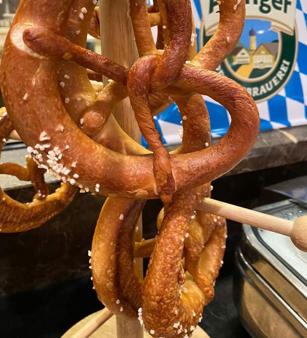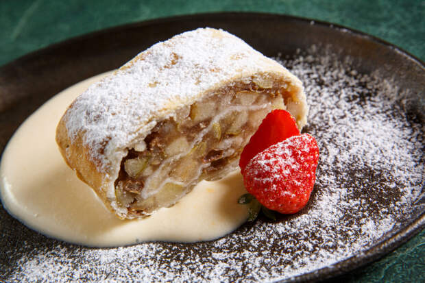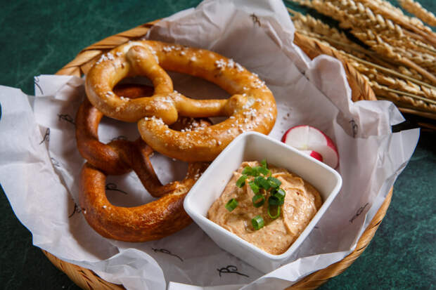 Сладкая нота Октоберфеста – традиционный немецкий десерт: теплый яблочный штрудель с нежным ванильным соусом (750 руб.). Отдельно можно заказать свежеиспеченный брецель (350 руб.).