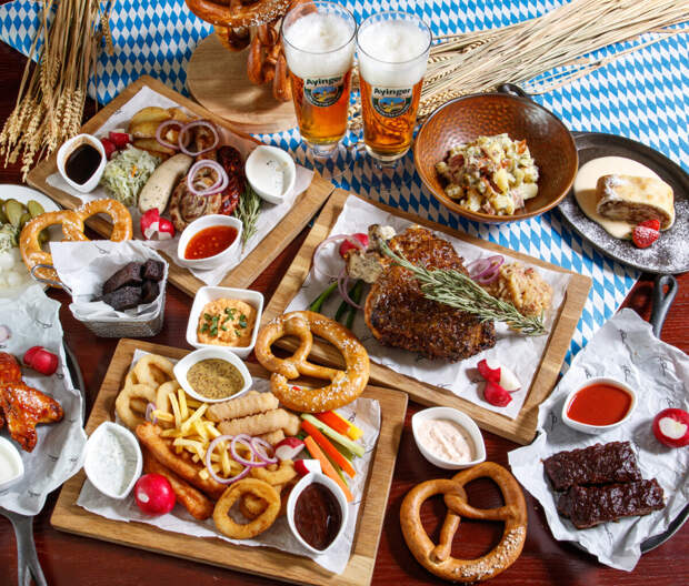 В специальном меню «Октоберфест» – разнообразие традиционных пивных закусок: картофельный салат по-баварски с ароматным беконом и пикантной заправкой (950 руб.), фермерское ассорти солений с квашеной капустой и маринованными огурчиками (550 руб.), специалитет баварской кухни – сырная паста обацда с брецелем (950 руб.), хрустящие гренки с чесноком с соусом «ранч» (450 руб.).