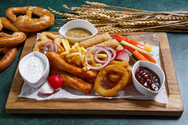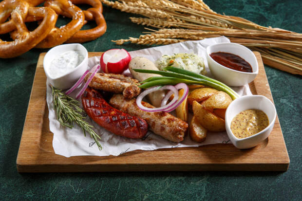 А еще ароматная рулька, томленая в пиве и запеченная до хрустящей корочки, с квашеной капустой по-баварски (2450 руб.), глазированные говяжьи ребра барбекю с пряным томатным соусом (1050 руб.), куриные крылышки в остром соусе «Баффало» (950 руб.), ассорти немецких колбасок и купат с соусами и картофельными дольками (1950 руб.) и пивная тарелка для компании с луковыми кольцами, куриными стрипсами, сырными палочками, кольцами кальмара, картофелем фри и овощным крудите с выбором соусов (1250 руб.).