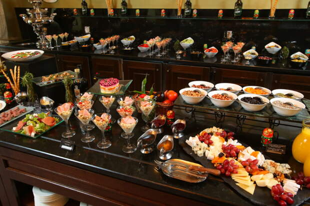 В меню на шведском столе – блюда на любой вкус: устрицы, копченый омуль, копченая форель, блины с красной икрой, многочисленные холодные закуски и салаты, мясная нарезка и ассорти сыров, пицца, несколько видов пасты, мясные и рыбные горячие блюда с различными гарнирами, множество десертов.