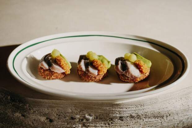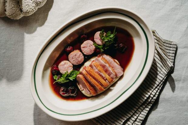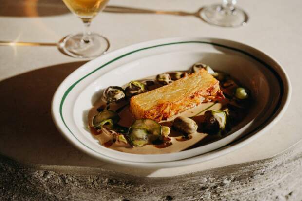 Бренд-шеф Ренат Царицанский подхватывает этот рустикальный стиль, не изобретая авторские сюжеты, но добавляя в классические блюда возможность нового опыта. К нежному куриному паштету с бриошью – желе из сидра, яблочное чатни и крем из яблок. К рийету из лосося – салат из огурца с сибулетом. К пате ан крут, который режут от большого пирога на открытой кухне, — вишня конфи, моченые огурцы, трюфельный айоли и зернистая горчица, чтобы от каждого кусочка свое впечатление. А к кок о ван – петуху в красном вине – и вовсе морковное пюре и груша конфи в лимонном фреше с куркумой. Знакомые вкусы шеф Pomme Verte пересобирает лишь затем, чтобы сделать подачи изящнее и современней. Так появляются золотистые шайбы картофеля дофин с бургундской сельдью в красном винном уксусе и маринованным яблоком, марсельский суп – между ухой и буйабесом – с черной треской, лососем, креветками и вырезанными нуазеткой шариками овощей или кассуле из утиной грудки с аккуратно выложенными на креме из сельдерея с вишневым конфи домашними утиными колбасками. И все, что нужно знать о кухне Нормандии – тонкие гречневые блины-галеты с сыром, луковый суп с гренкой под румяной коркой грюйера, золотистый питивье с начинкой из томленых щек и мясным соусом с черносливом, песочный пирог с уткой конфи, рубленый стейк аше и говяжьи щеки по-бургундски, запеченная на медной сковородке рыба с томатами, каперсами и оливками, картофелем и травами, теплый яблочный пирог, приготовленный на манер гратена, и мадленки в глазури из сидра к каждой чашке кофе – все на своем месте.