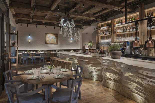 От винтажного пресса для сидра, найденного на старой ферме в Нормандии, подлинной реликвии, которая получила новую жизнь и стала символом ремесла в интерьере нового московского ресторана. До струящейся как цветущее яблоневое дерево люстры над баром. От домашней утвари, собранной на французских барахолках, до коллекции картин современных художников как оммаж творившим в Нормандии Бодлеру, Коро, Будену, Сислею и Моне: «Тюльпанов» Саши Савиной, сложивших лепестки в силуэт человеческой фигуры, окутанного сакральным смыслом ягненка Алисы Валевской, картины-истории Арины Федчиной «Девять мужчин переносят рояль» в голубой уборной, которая и сама словно ожившая вангоговская «Комната в Арле».