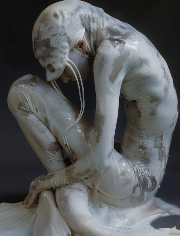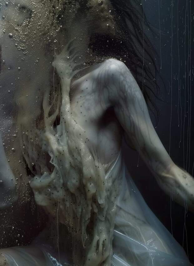Сегодня она позиционирует себя не как арт-fashion-фотограф-дизайнер (нужное подчеркнуть), а как творец новой формации — креатор! В работах Rosemary человек предстает как иной биологический вид: все модели покрыты слизью, будто они только что появились на свет. Среди них есть и автопортреты, и реальные съемки, и AI-модели, то есть симбиотические креатуры, созданные в сотворчестве с машиной.Венера явилась в мир с меланхоличным взглядом и в стыдливой позе