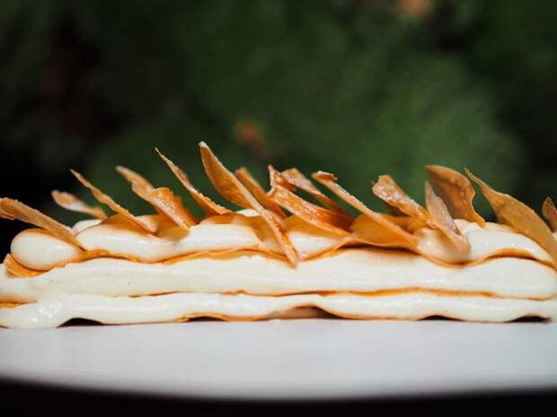 - Хрустящий мильфей (800 ₽) на основе фило с заварным кремом и малиной.