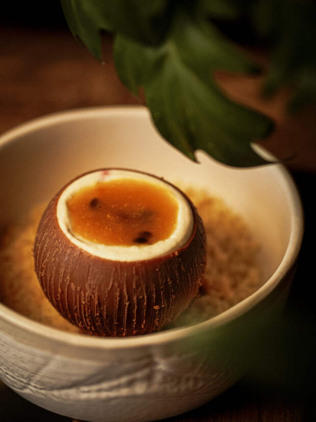 - Кокос без сахара (700 ₽) — сырный мусс с начинкой из манго и маракуйи, сублимированной малиной и молочным шоколадом.