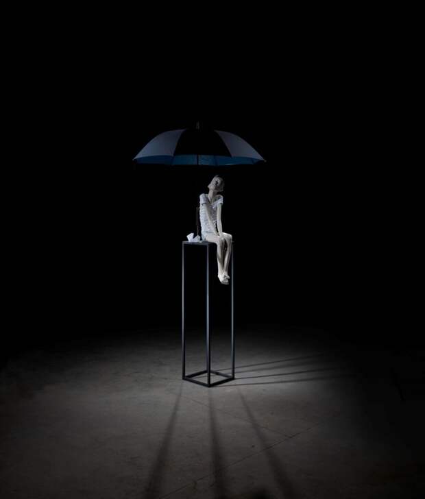 Герои Ван Куньчжао закрывают лица ладонями, прячутся под зонтами и ощущают одиночество в толпе. Каждая скульптура автора — это своего рода монумент естественному человеку, сбросившему оковы социального «Сверх-Я» и переживающему это состояние как переломный момент, экзистенциальную ситуацию.